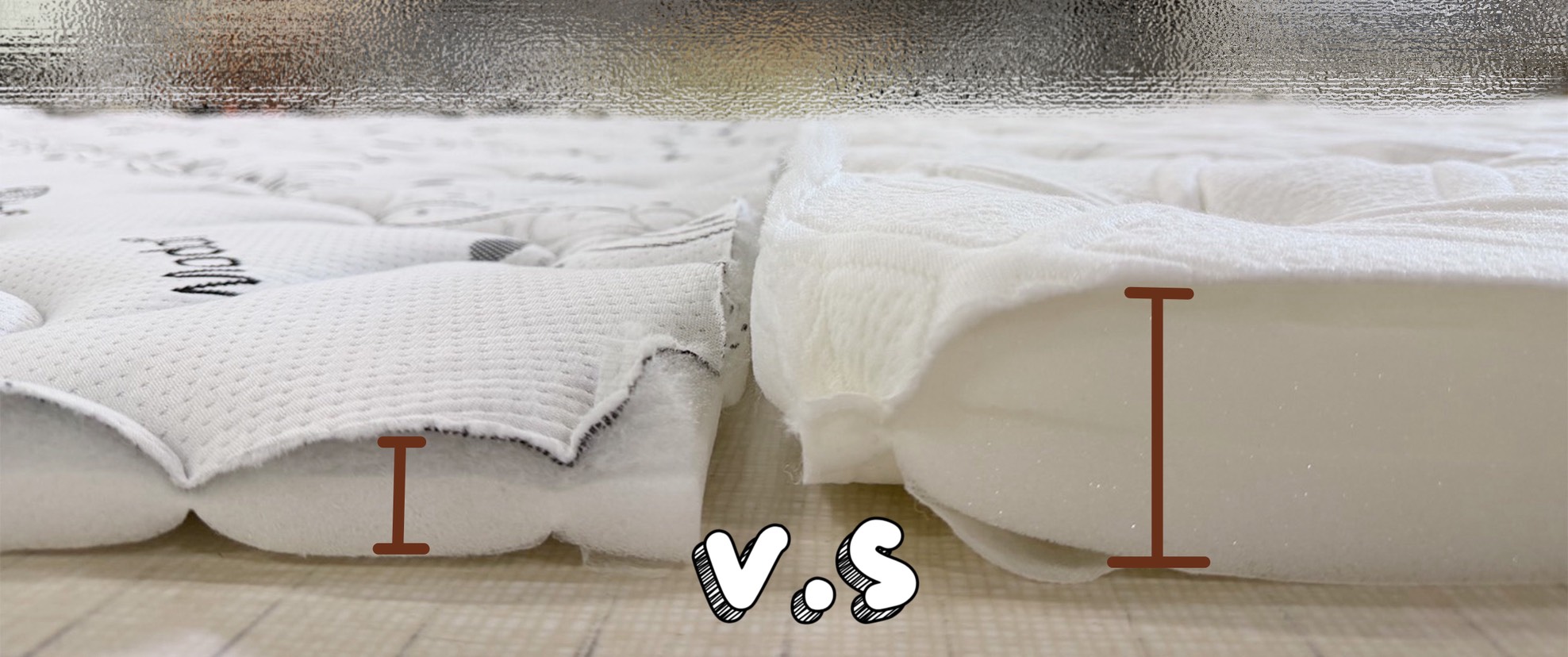 現在的獨立筒床墊基本上除了舒適層材料以外,光是面布裡的發泡材料厚度就差了兩倍,