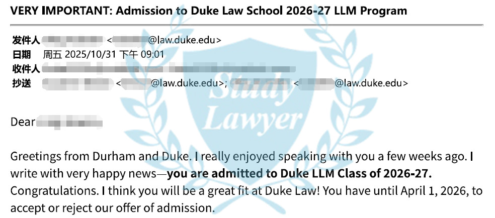 一位申請者於近日收到了今年排名並列第6的杜克大學法學院明年秋季入學的LLM錄取通知,恭喜!