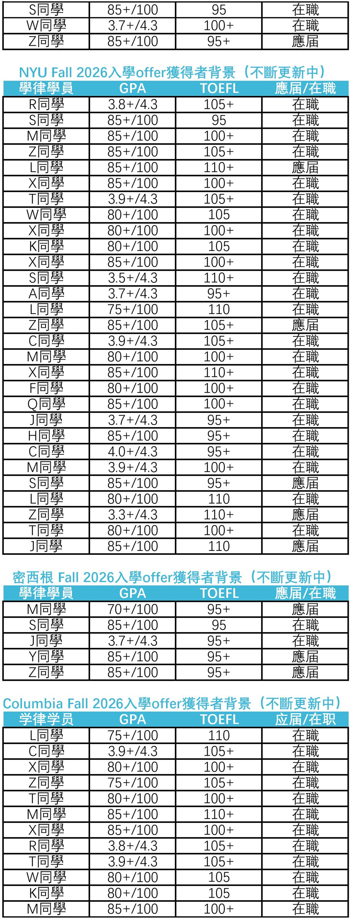 目前為止,學律申請者已收到美國T14法學院LLM offer總計