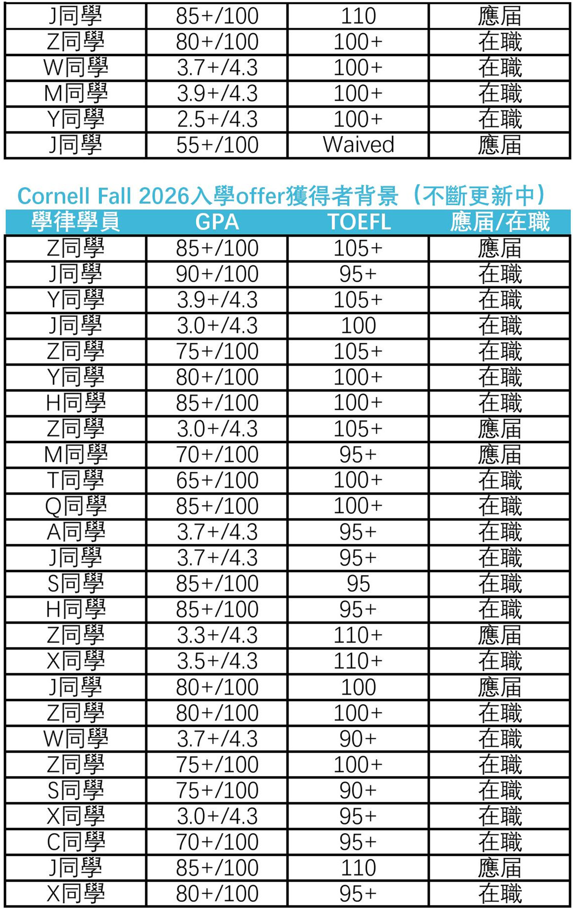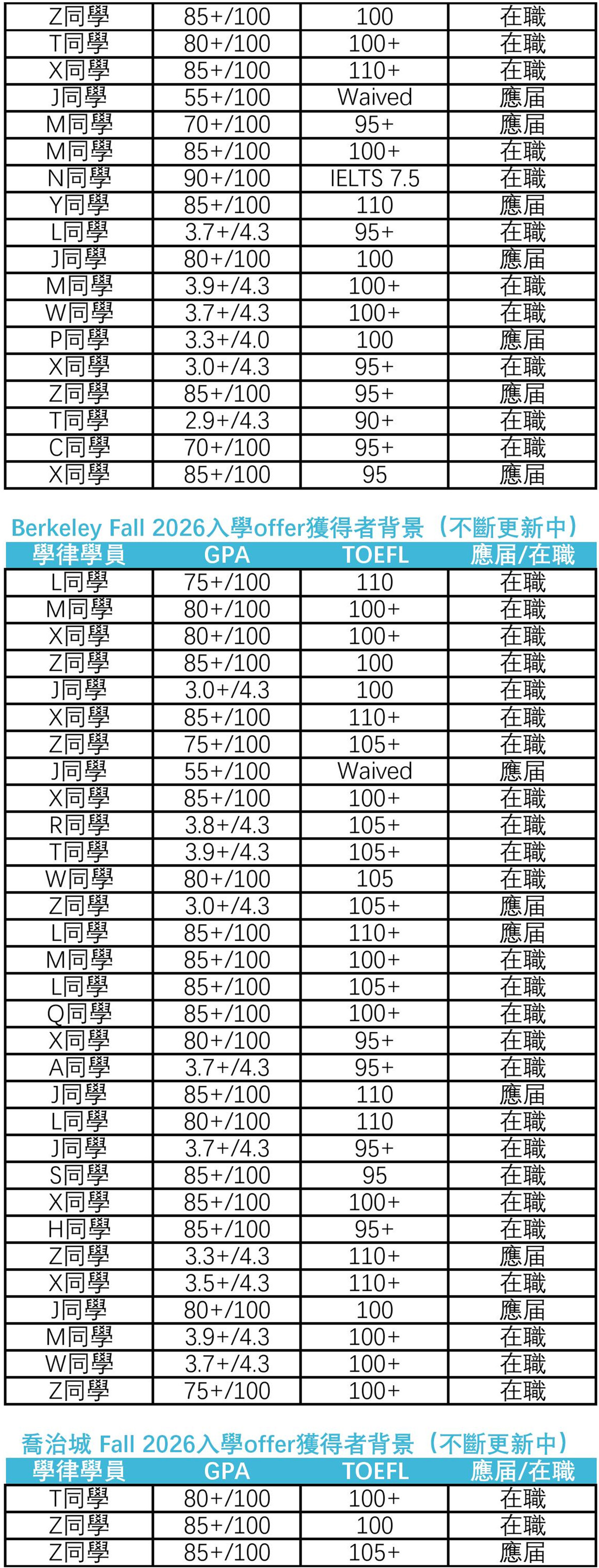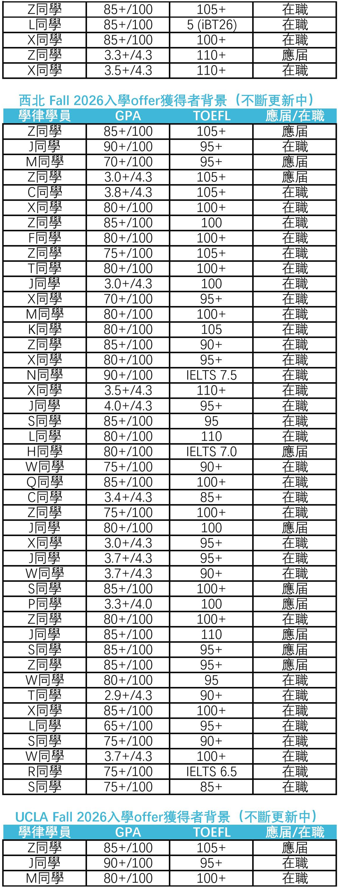 232張,包括芝加哥大學10張、維吉尼亞大學7張、賓夕法尼亞大學22張、杜克大學11張、紐約大學29張、密西根大學5張、哥倫比亞大學17張、西北大學44張、UCLA 21張、UC Berkeley 31張、喬治城大學9張和康乃爾大學26張。隨著申請季的推進,相信學律申請者將收到更多頂尖法學院offer。